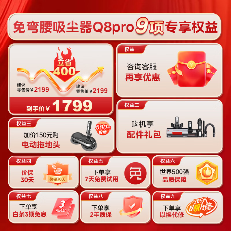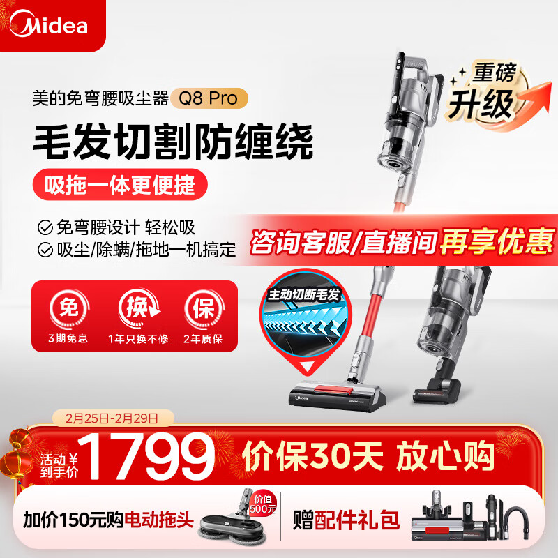 美的(Midea)吸尘器家用手持无线 Q8 Pro拖地机吸尘拖地洗地一体机除螨仪除螨刷宠物毛发防缠免弯腰价格:1799.00元!