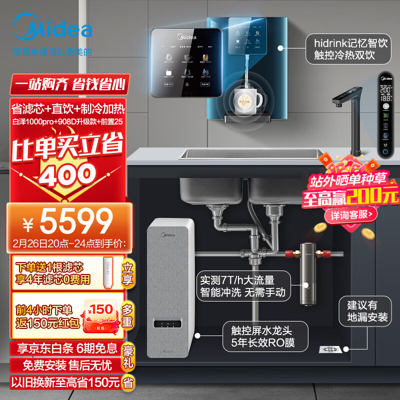 美的(Midea)省芯直饮冷热净水器套装【白泽1000pro+管线机908D+前置-25pro】hidrink 壁挂式加热一体净饮机价格:5599.00元!