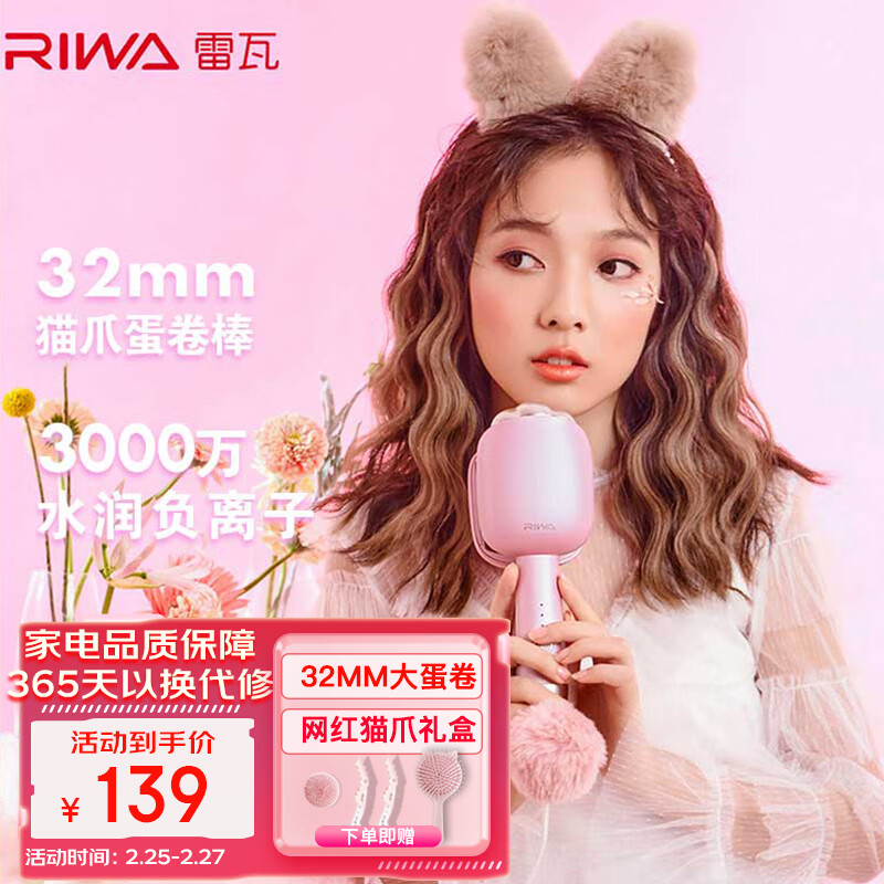 雷瓦(RIWA)卷发棒蛋卷棒 32mm夹板负离子大蛋卷水波纹烫发棒 懒人卷发神器蛋蛋卷发棒8120-ION 女神节礼物价格:179.00元!
