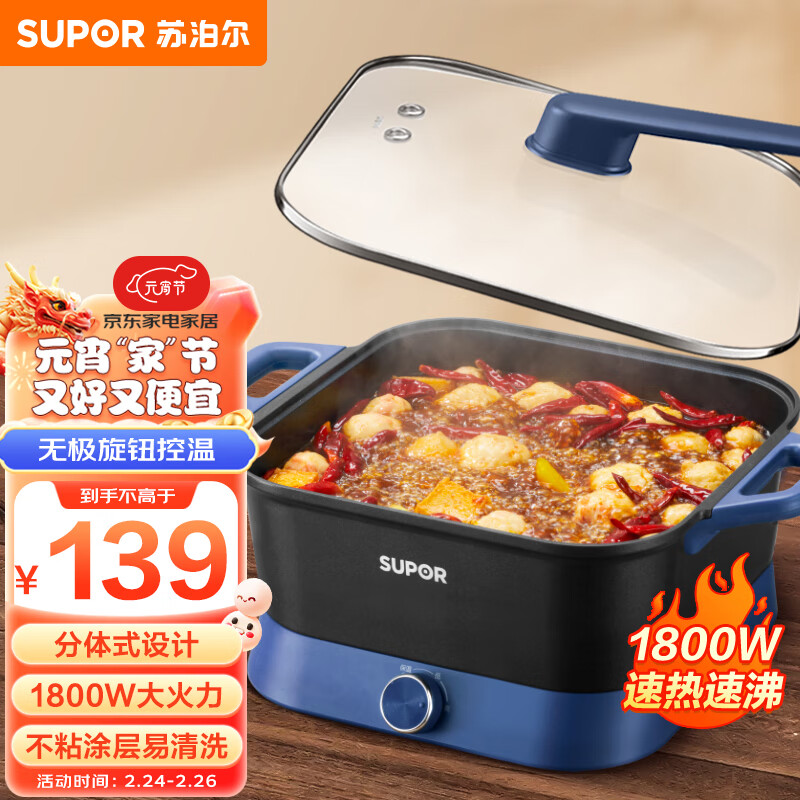 苏泊尔(SUPOR)电火锅 电煮锅 火锅专用锅 家用火锅锅 电锅一体多功能锅打火锅 6L电热锅 多用途锅H3030FK870价格:139.00元!