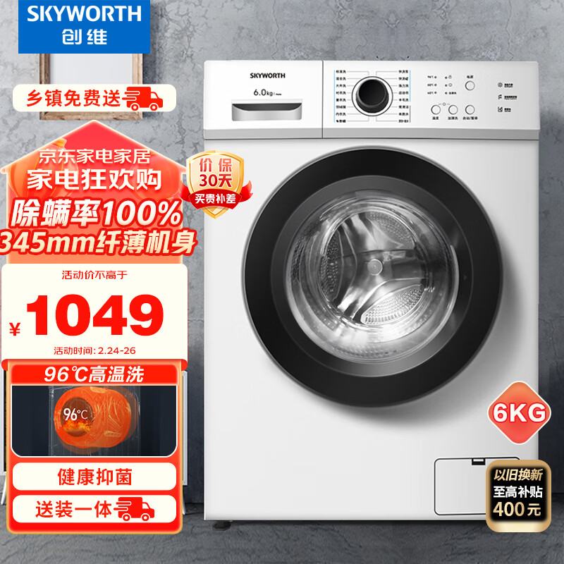 创维(SKYWORTH) 6公斤全自动滚筒洗衣机? 超薄嵌入 金属机身 16种洗涤程序 高温除螨洗 F60A价格:1049.00元!