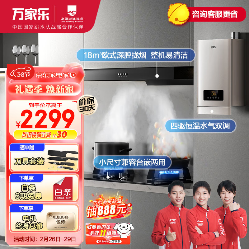 万家乐 抽油烟机18m3/min欧式油烟机4.2kW大火力燃气灶16升大水量热水器三件套AT031+KA031B+16LD5天然气价格:2499.00元!