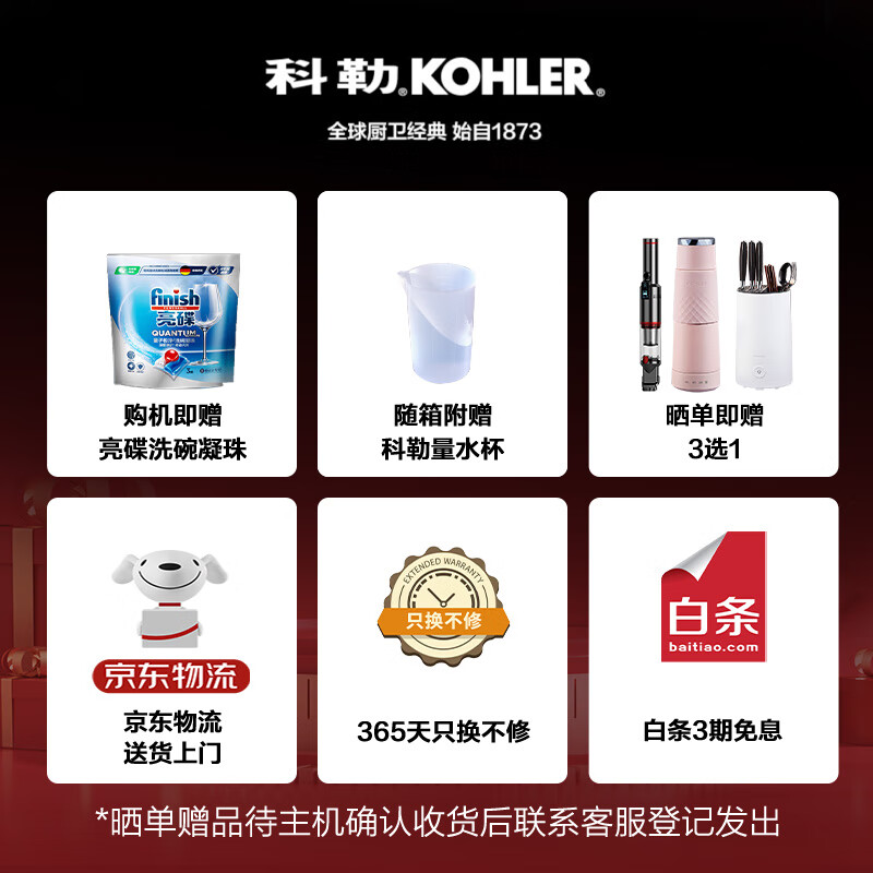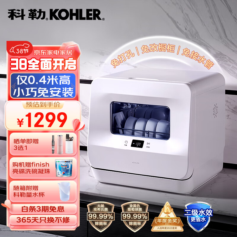科勒(KOHLER)免安装台式洗碗机 家用独立式小型台上刷碗机 台面全自动洗碗机 UV紫外线消毒一体机29974T-NA价格:1299.00元!