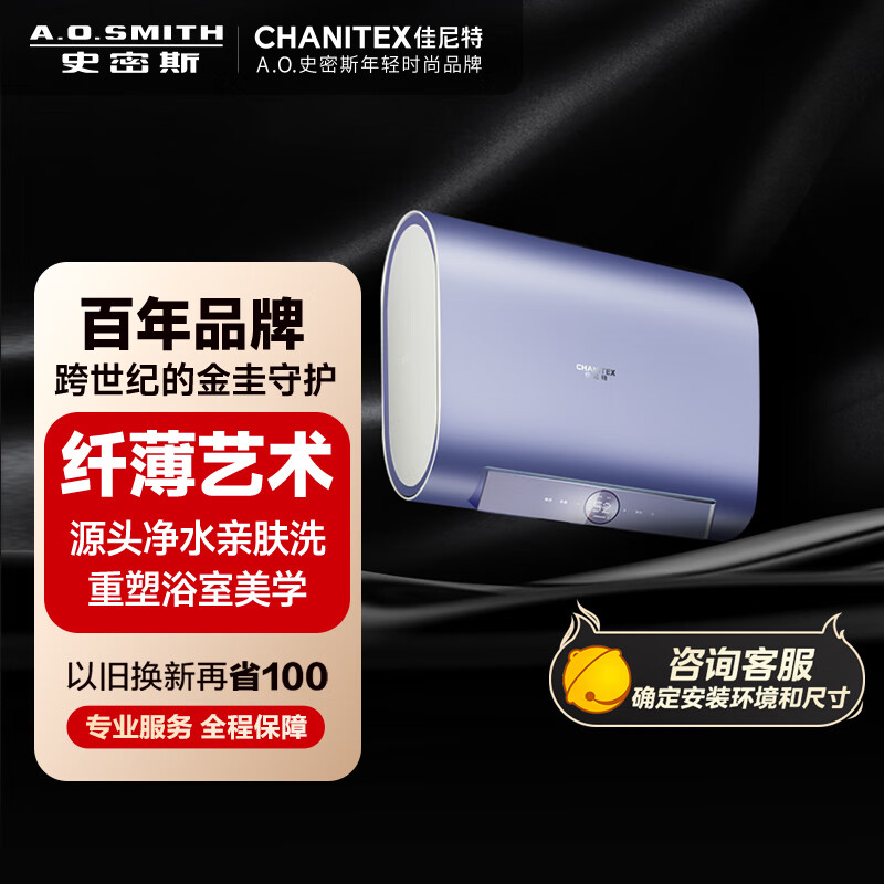 史密斯(A.O.SMITH)佳尼特60升电热水器 超薄双胆扁桶 双3kW速热 智能操控 专利免清洗 净水亲肤 CTE-60HT2 以旧换新价格:3298.00元!