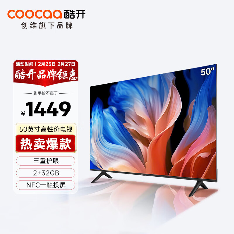 酷开创维K3 50英寸电视 2+32G内存 无边屏 智能语音 多功能投屏平板游戏液晶电视机以旧换新50P3D价格:1599.00元!