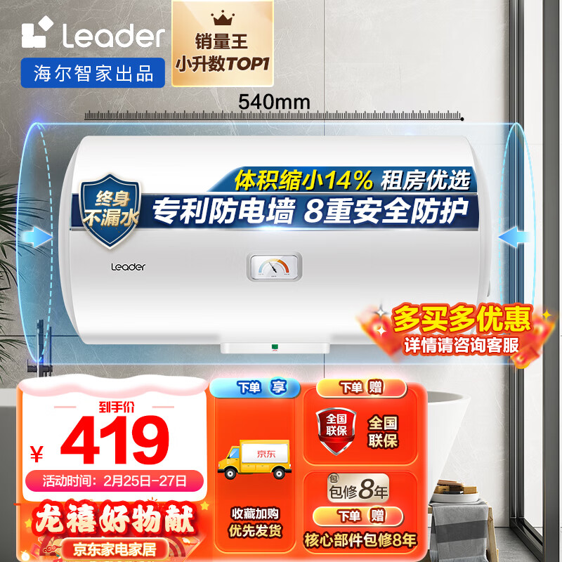 海尔智家出品 Leader电热水器40升 2200W保温家用 多重防护 专利防电墙 LES40H-LC2(E)价格:419.00元!