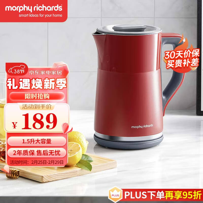 摩飞电器(Morphyrichards)电热水壶 烧水壶 热水壶 家用恒温水壶 1.5L全不锈钢304双层防烫实时显温开水壶 MR6070 红价格:189.00元!