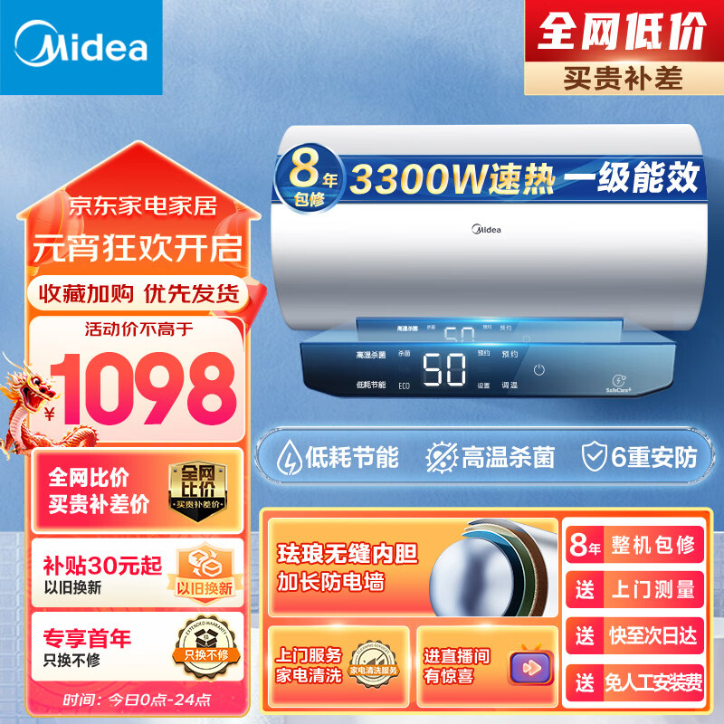 美的(Midea)热水器家用3300W速热一级能效ECO节能72小时低耗保温6重安防80升大水量电热水器F8022-JM1(HE)价格:1098.00元!