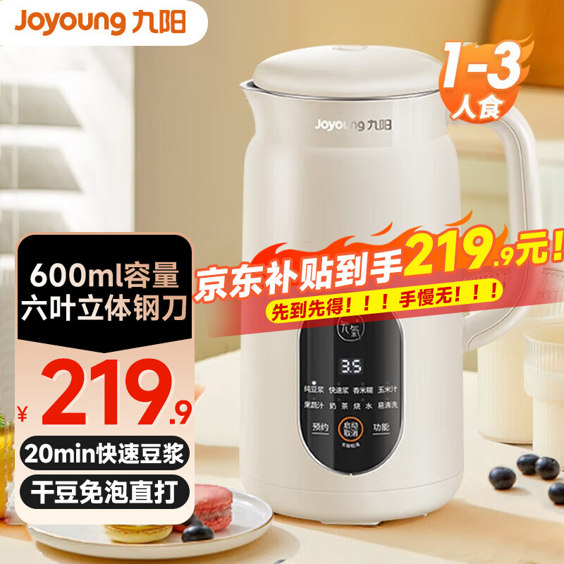 九阳(Joyoung)多功能豆浆机家用便携式轻量600ml自动智能预约清洗免滤 DJ06X-D525价格:219.90元!
