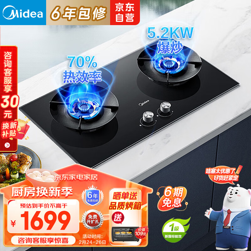 美的(Midea)燃气灶天然气 双灶具 家用5.2kW猛火聚能灶台嵌两用 搪瓷易打理 高能效灶 节能灶 Q529L-M价格:1699.00元!