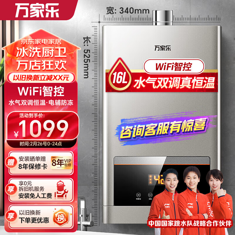 万家乐(Macro)燃气热水器 智能恒温家用 水气双调 恒温热水器 天然气-16M2【16升/WIFI智控/电辅防冻】价格:1199.00元!