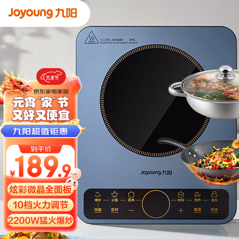 九阳(Joyoung)电磁炉套装电磁灶电池炉2200W家用带锅一键爆炒定时功能年炫彩大面板C22S-N410-A1配汤锅炒锅价格:189.90元!