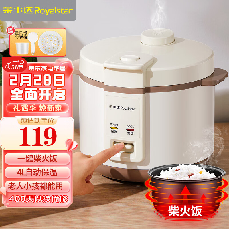荣事达(Royalstar)电饭煲家用4L不沾内胆微压焖香柴火饭小型迷你多功能一键机械式带蒸笼电饭锅 RX-40V1价格:119.00元!