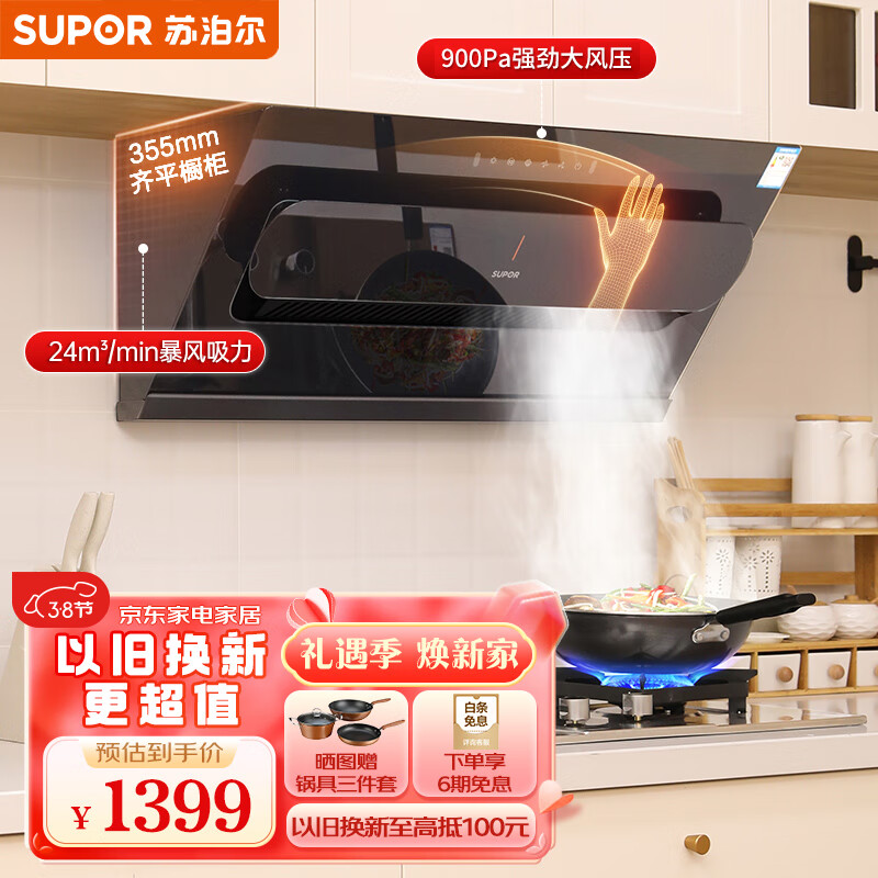 苏泊尔(SUPOR)抽油烟机 24m3/min大吸力 变频侧吸式脱排抽吸油烟机家用 挥手智控免拆自动清洗厨房排烟机 DJ50S价格:1399.00元!