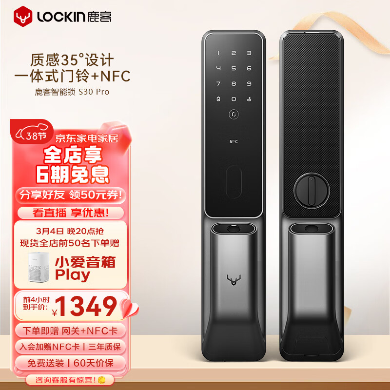 鹿客(lockin)S30Pro内置门铃全自动智能门锁指纹密码电子锁支持APP智能联动价格:1899.00元!