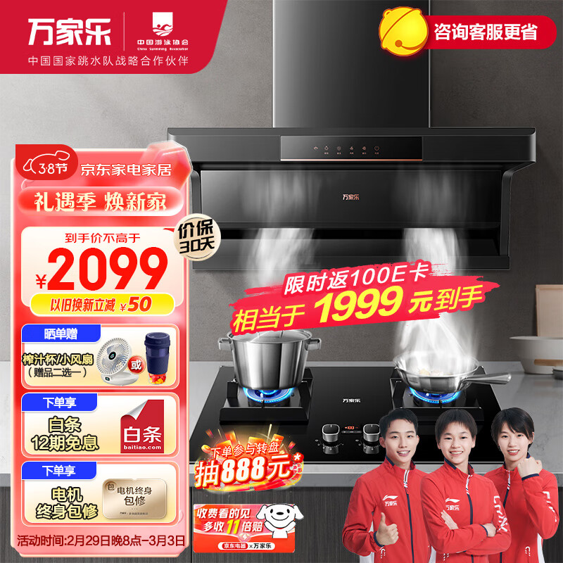 万家乐 抽油烟机 顶侧双吸油烟机 智能定时烟灶套装22m3/min大吸力挥手油烟机灶具套装AK5+KV062B液化气价格:2299.00元!