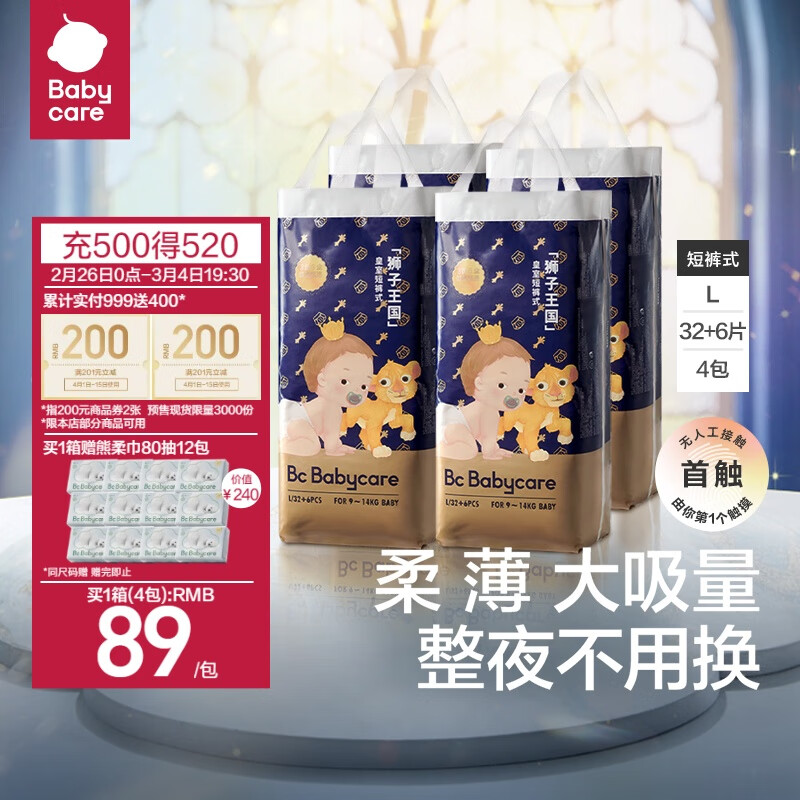 babycare皇冠LaLa裤皇室狮子王国拉拉裤婴儿尿不湿箱装L38片*4包9-14kg价格:476.00元!