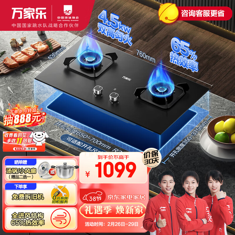 万家乐燃气灶4.5kw大火力 家用嵌入式煤气灶双灶台嵌两用双灶烟灶联动全进风可调节开孔JZY-KV063B液化气价格:1199.00元!