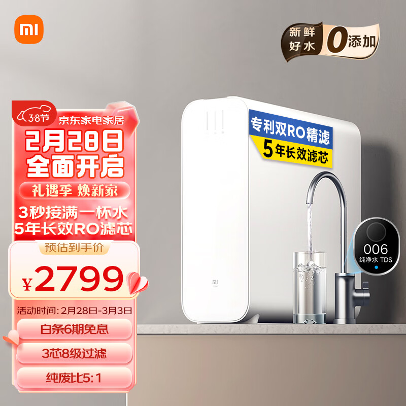 米家小米双核净水器1200G家用净水机 厨下式直饮机 无罐直饮水 5年长效RO滤芯 5:1纯废水比 3.2L/分价格:2799.00元!