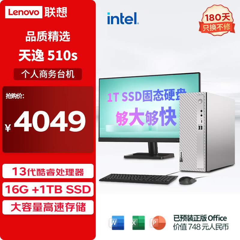 联想(Lenovo)天逸510S商务办公台式机电脑主机(酷睿13代i5-13400?16G 1TB SSD wifi win11 )23英寸显示器价格:4049.00元!