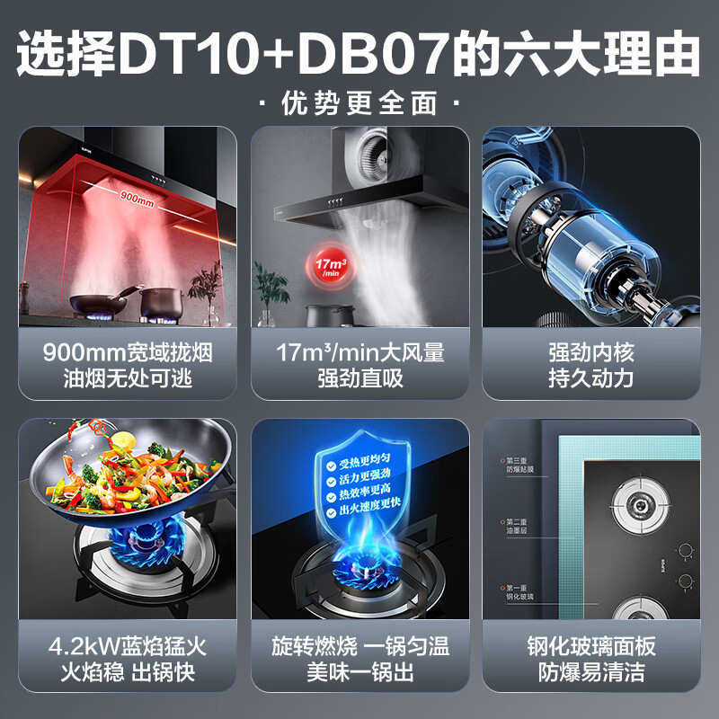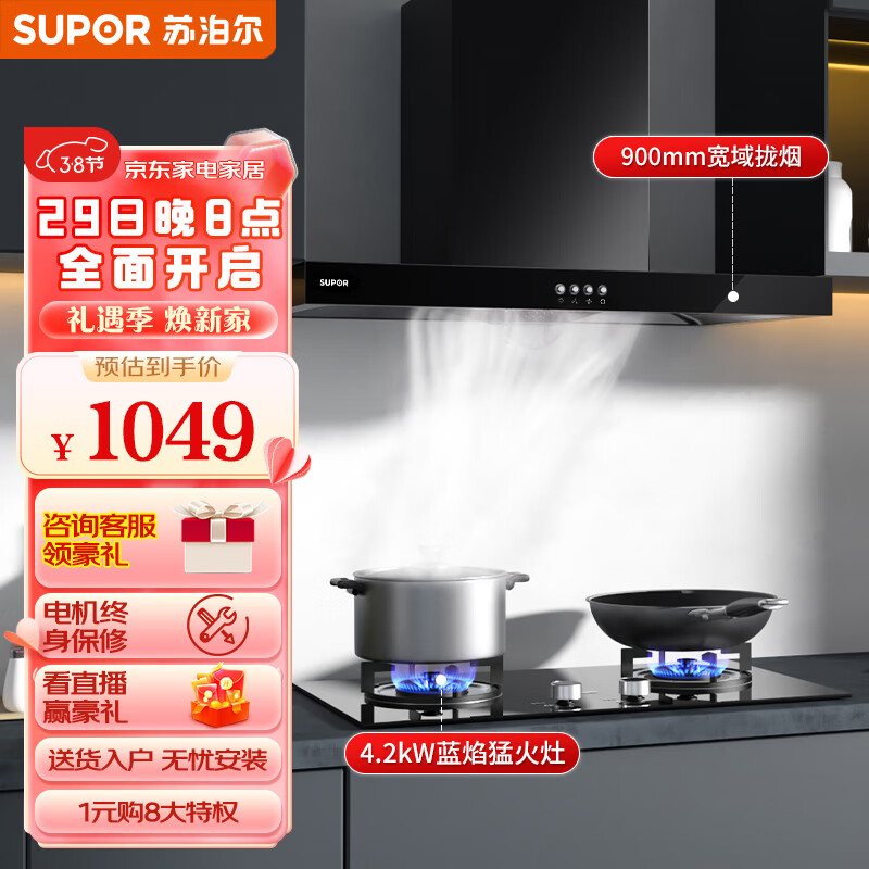 苏泊尔(SUPOR)排油烟机 宽域拢烟大吸力油烟机 家用易清洁欧式顶吸抽油烟机 吸油烟机燃气灶套装DT10+DB07液化气价格:1049.00元!