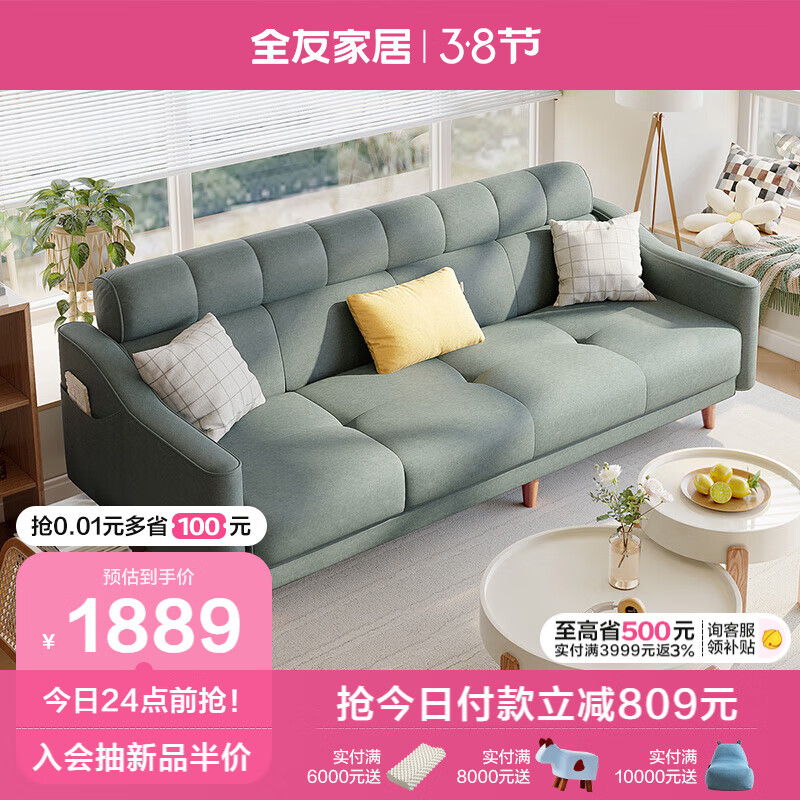 全友家居 北欧简约科技布艺沙发客厅三人位小户型可折叠沙发床102265价格:2698.57元!