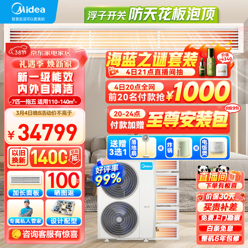 美的(Midea)中央空调一拖五风管机7匹多联机新一级能效全直流变频冷暖清洁嵌入式MDS-H180W-A(1)Ⅲ价格:34899.00元!
