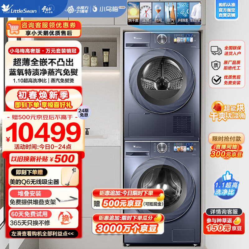 小天鹅(LittleSwan)洗烘套装10kg滚筒洗衣机全自动+热泵烘干机 蓝氧超薄全嵌 1.1洗净比【小乌梅高奢版】TG100VIC+S88价格:10999.00元!