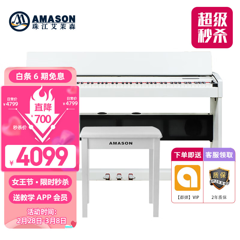 艾茉森(Amason)珠江钢琴 考级电钢琴88键重锤数码电子钢琴专业手感F10白色价格:4799.00元!