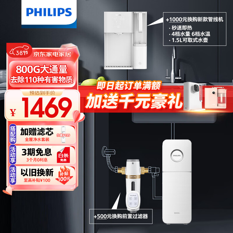 飞利浦(PHILIPS)净水器家用净水机引擎800G 5年长效RO反渗透直饮机 2.1L/min大流速800G通量净水器AUT7006/7025价格:1469.00元!