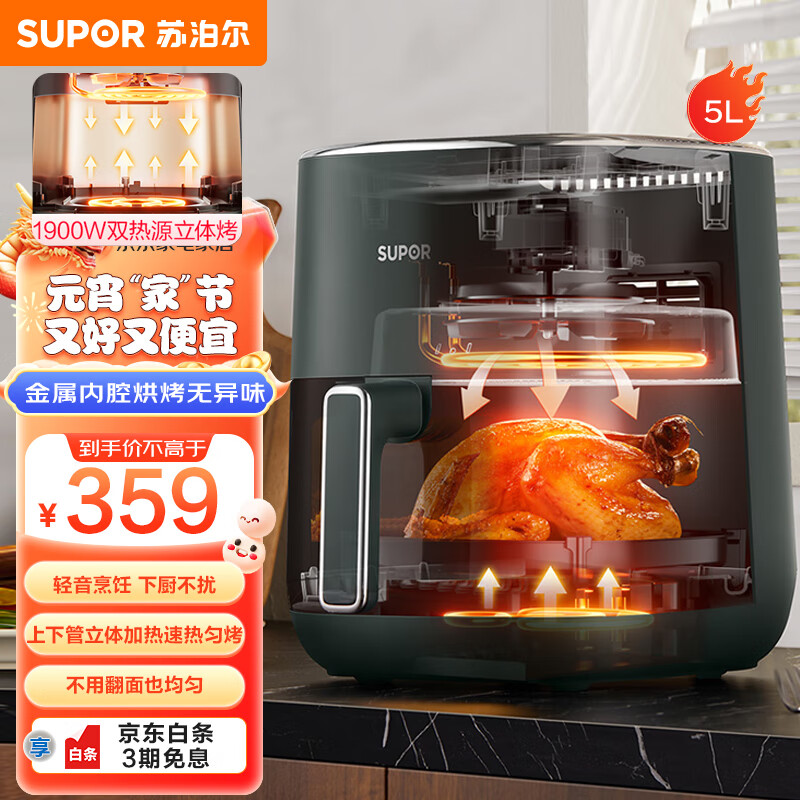 苏泊尔(SUPOR)不用翻面 空气炸锅 5L家用大容量 双热源立体烘烤 可视窗口 全显影 智能触控 免翻面炸锅KD50D880价格:359.00元!
