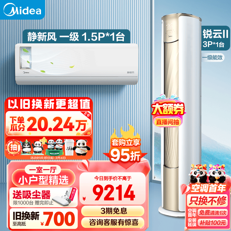 美的(Midea)小户型精选 套购一站式 锐云2代空调套装 (1.5匹静新风+3匹锐云)价格:9698.00元!