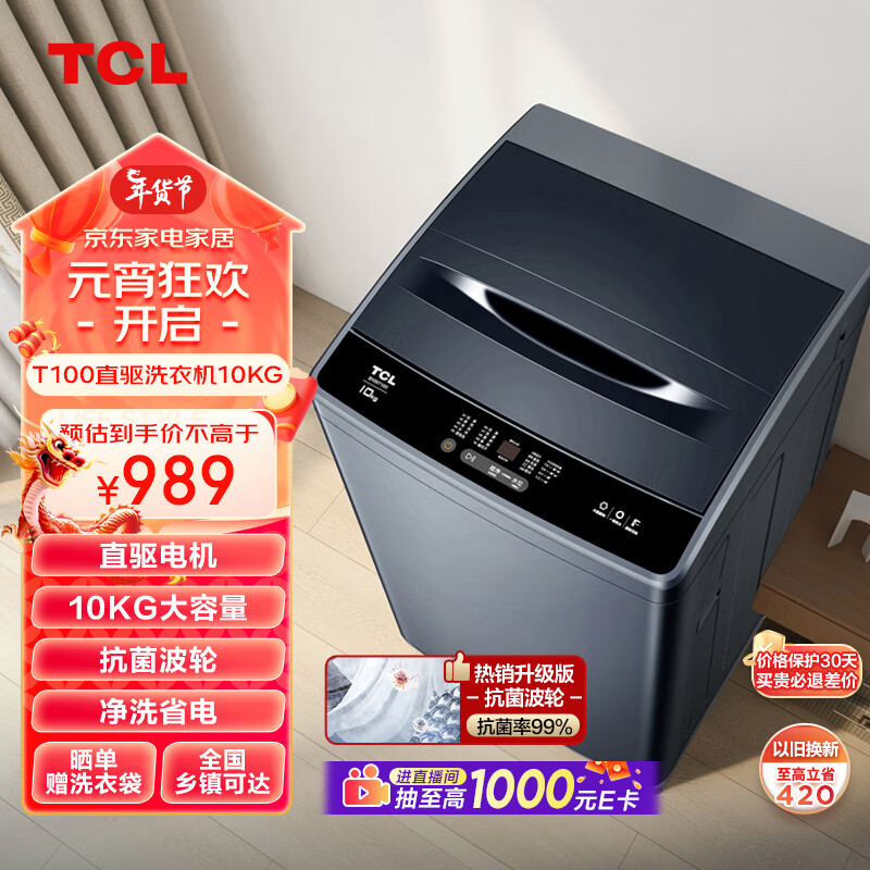 TCL 10KG波轮T100大容量直驱变频洗衣机 全自动波轮洗衣机 24小时预约 0.9洗净比 一级能效B100T100-D价格:989.00元!