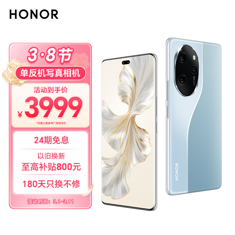 荣耀100 Pro 单反级写真相机 荣耀绿洲护眼屏 第二代骁龙8旗舰芯片 16GB+512GB 迷蝶蓝 5G价格:3999.00元!