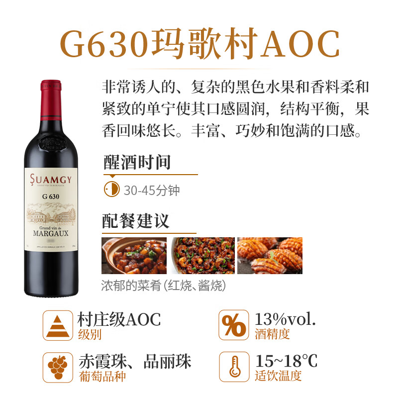 圣芝(Suamgy)G630玛歌村AOC赤霞珠干红葡萄酒 750ml*6瓶 整箱装 法国进口红酒价格:2519.00元!