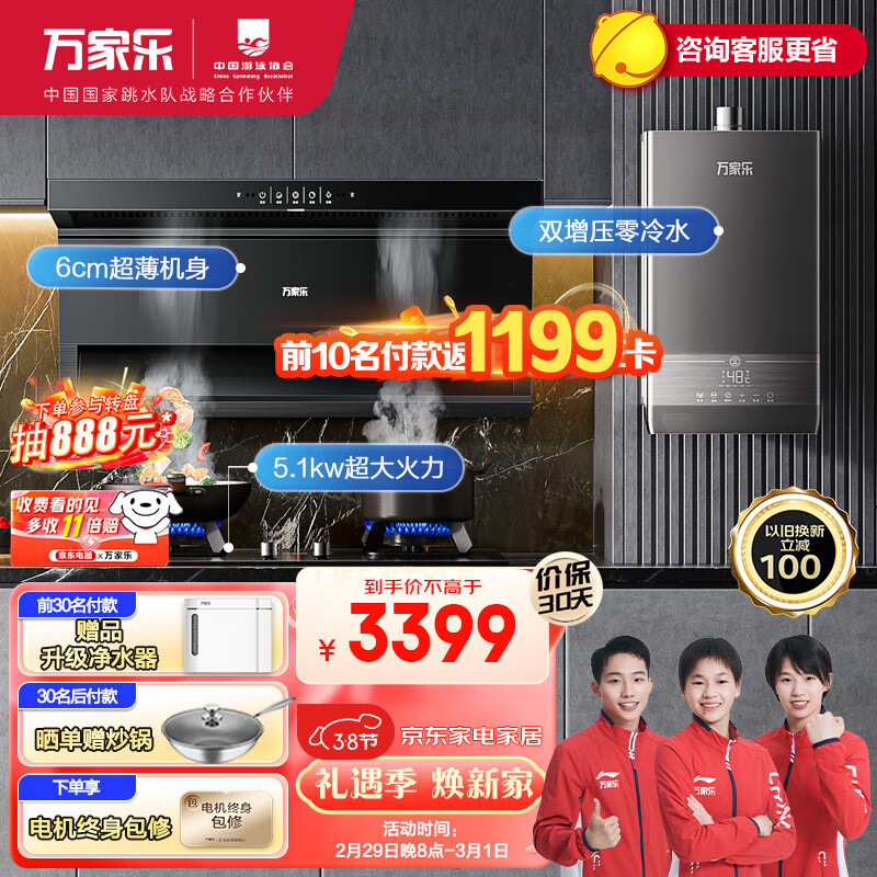 万家乐顶侧双吸油烟机 23立方厨卫烟灶热三件套装 16L双增压零冷水热水器套装TAK5+TAC5+16DL1天然气价格:3599.00元!