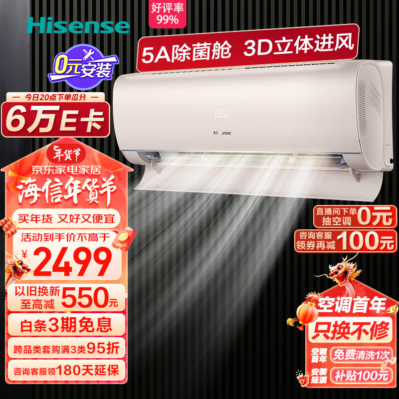 海信(Hisense)1.5匹 5A除菌舱 新一级冷暖智能防直吹壁挂式卧室空调挂机KFR-35GW/S550-X1【一价全包版】价格:2499.00元!