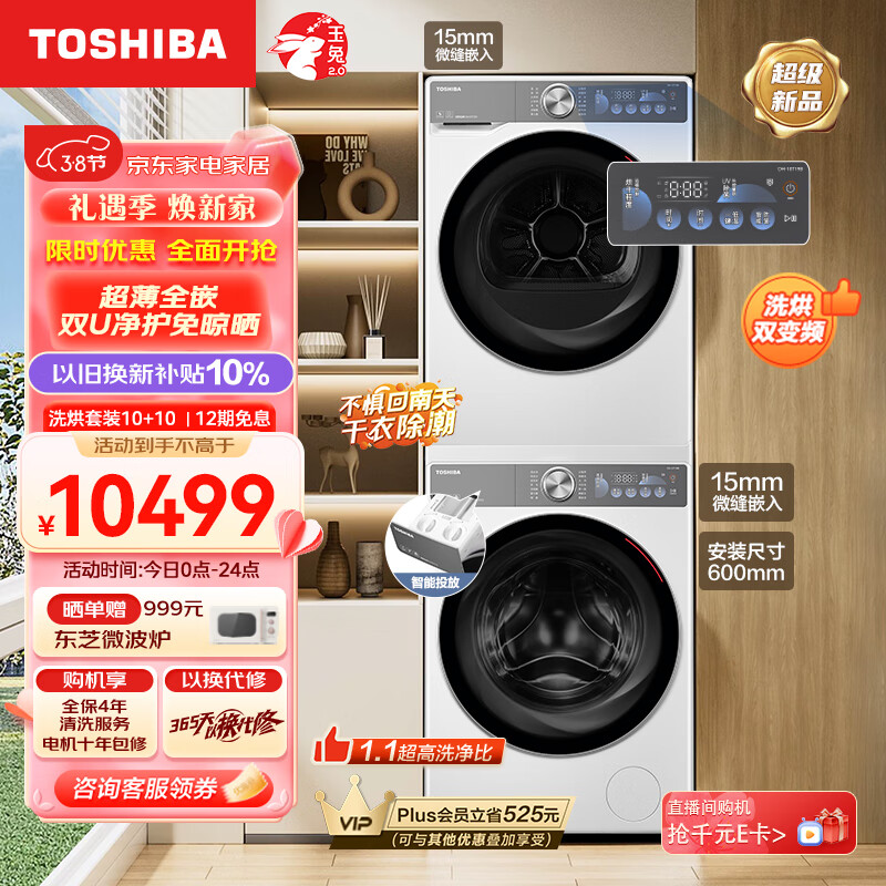 东芝(TOSHIBA)玉兔2.0智投版超薄洗烘套装 DG-10T19BI+DH-10T19B 10KG全自动滚筒洗衣机+10KG热泵式变频烘干机价格:10499.00元!