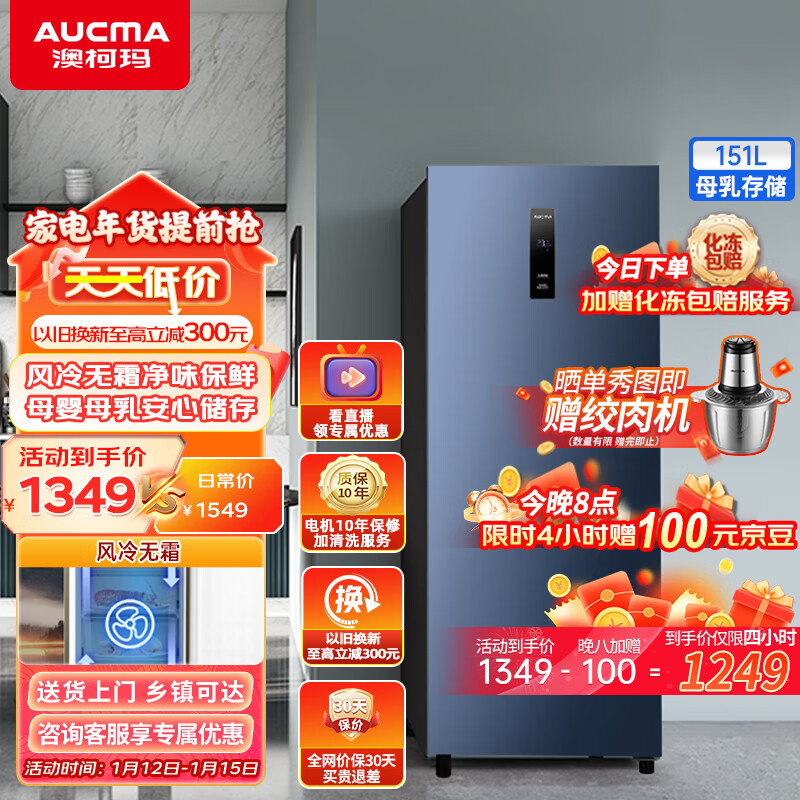 澳柯玛(AUCMA)151升风冷家用立式冰柜母乳冷藏冷冻柜抽屉式冷柜囤货冷藏柜小冰柜家用小型冰箱BD-151WNE以旧换新价格:1449.00元!