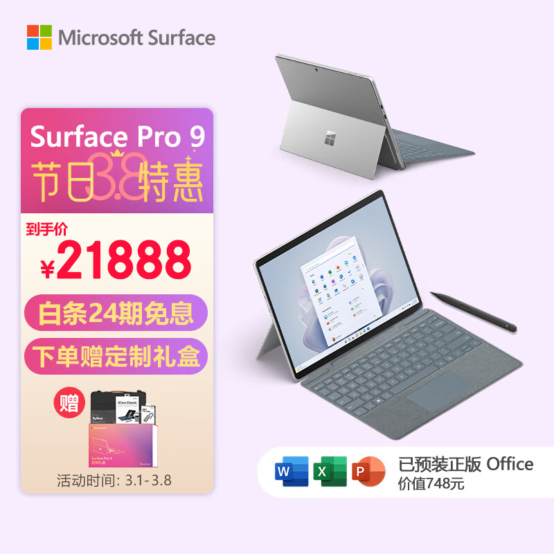 微软Surface Pro9 亮铂金+冰晶蓝带触控笔键盘盖i7 32G+1T二合一游戏平板13英寸120Hz触控屏笔记本电脑价格:21888.00元!