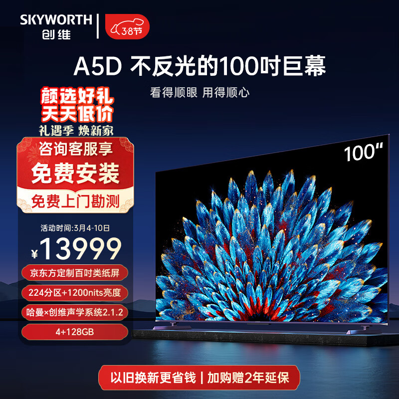 创维电视100A5D 100英寸电视机定制百吋类纸屏哈曼调音一级能效1200nit巨幕大屏会议平板电视98英寸+价格:14499.00元!
