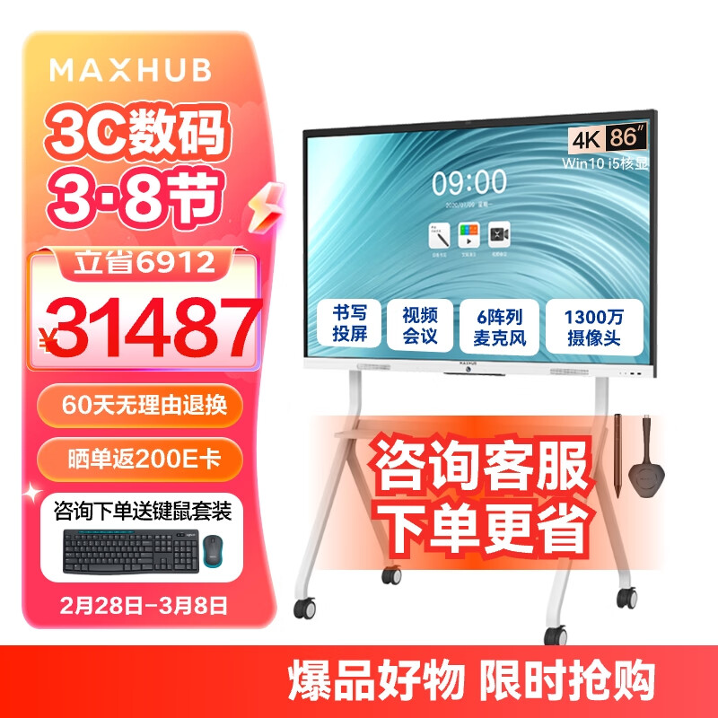 maxhub视频会议平板一体机教学智慧屏摄像头麦克风触摸屏白板新锐Pro86 Win10+时尚支架+无线传屏+笔价格:31487.00元!