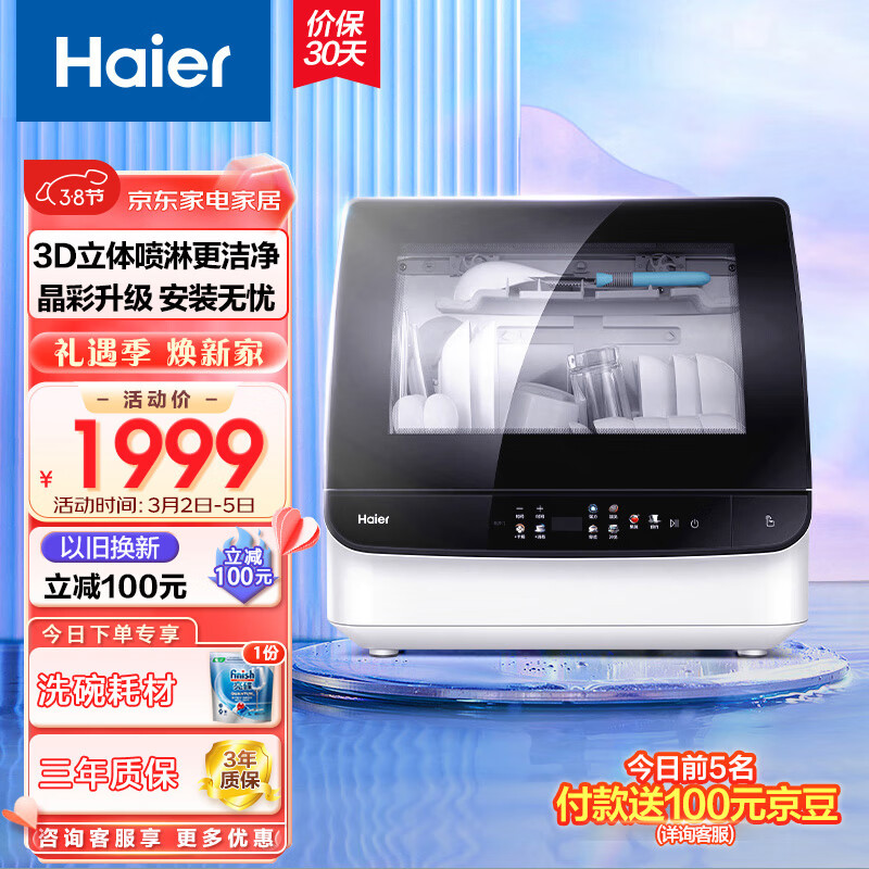 海尔(Haier)洗碗机台式家用2-4口之家 晶彩屏高温除菌变频洗碗机 小海贝ETW42286BKU1价格:1999.00元!