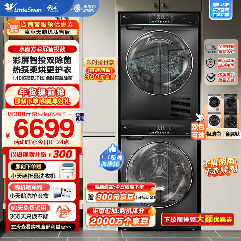 小天鹅(LittleSwan)水魔方洗烘套装 10KG滚筒洗衣机全自动+热泵烘干机【87升级款】智能投放 1.1洗净比 TG100VC8+806价格:6999.00元!