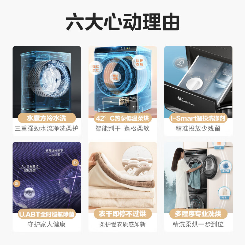 4、买的小天鹅系列一整套的洗烘套装,颜值够,尺寸也正好,外观大气,声音小,颜色好看!值得购买!除菌效果好,容量也比较大,洗的多!