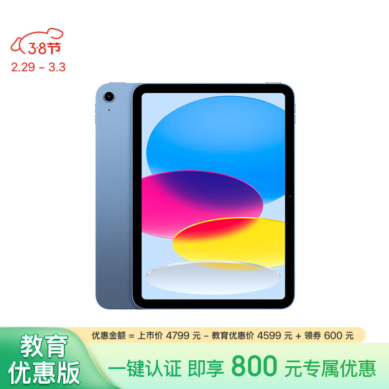 Apple/苹果【教育优惠】iPad 10.9英寸 2022款(256GB WLAN版/A14芯片/学习办公娱乐/MPQ93CH/A)蓝色价格:4599.00元!
