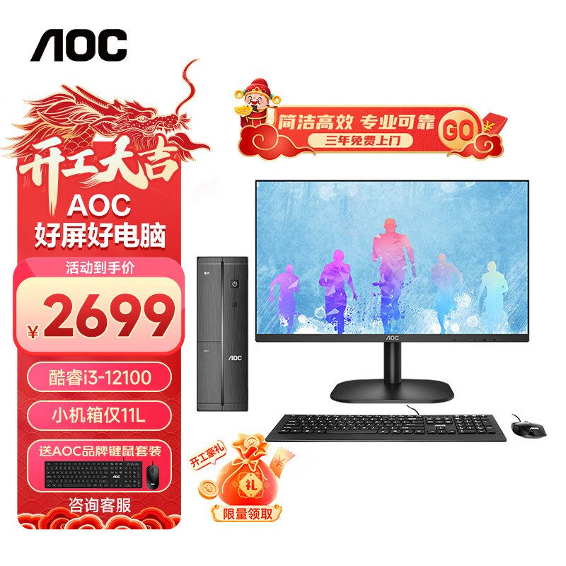AOC 荣光910 高性能商用办公台式机电脑主机(12代i3-12100 16G 1TB WIFI键鼠 三年上门)23.8英寸价格:2699.00元!