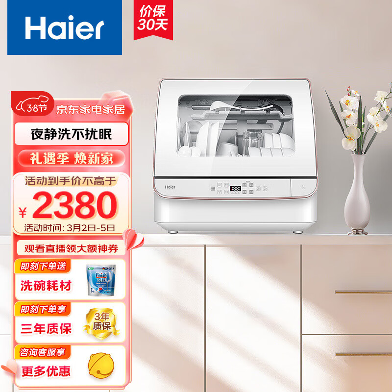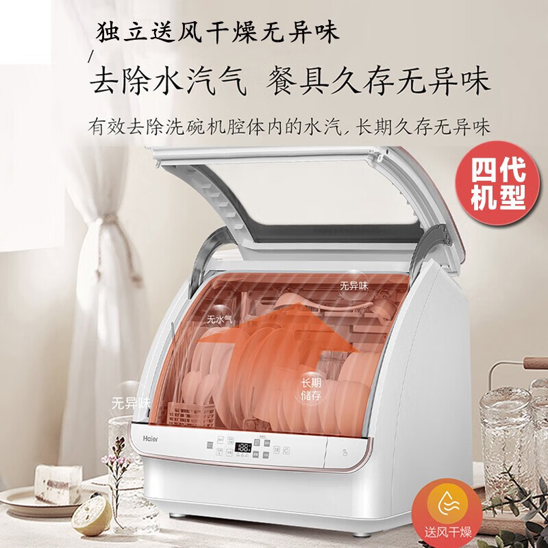 海尔(Haier)洗碗机台式家用2-4口之家高温除菌双效烘干变频直驱电机离子软水夜静洗刷碗机小海贝ETBW402RG价格:2380.00元!