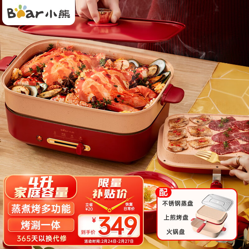 小熊(Bear)多功能锅 料理锅 家宴锅火锅专用锅多用途锅烤肉锅 家用电火锅蒸煮煎烤涮炒烙一体网红款 C18N2 4L价格:349.00元!