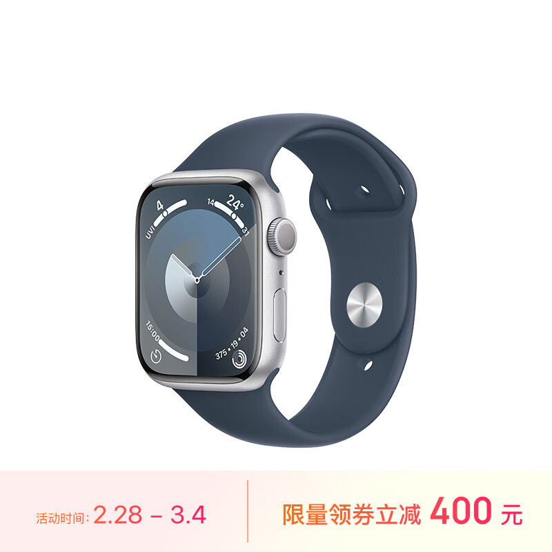Apple/苹果 Watch Series 9 智能手表GPS款45毫米银色铝金属表壳 风暴蓝色运动型表带S/M MR9D3CH/A价格:3199.00元!